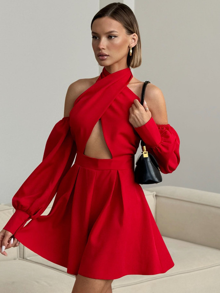 Красный Женщины Мини-платье с короткими рукавами и V-образным вырезом